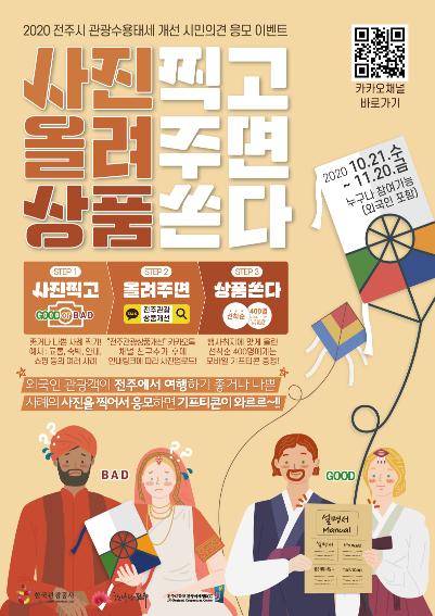 이와 함께 다음 달 20일까지 외국인 관광객에 대한 수용태세를 개선하기 위한 이벤트도 진행한다. ‘전주관광상품개선’카카오톡 채널을 친구 추가한 후 외국인을 위한 교통, 숙박, 서비스 등의 잘된 점과 잘못된 점에 대한 사진과 개선의견을 올리면 선착순 400명에게 기프티콘이 증정된다.