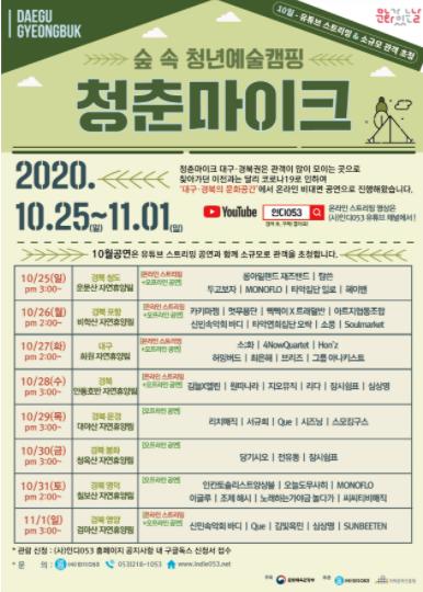 더불어, 10월 "문화가 있는 날" 문화행사로 대구,경북권 국립자연휴양림 5개소(운문산, 대야산, 청옥산, 칠보산, 검마산)에서 재즈, 마술, 뮤지컬, 밴드 등 다양한 장르의 청춘마이크 공연을 온.오프라인으로 진행한다.