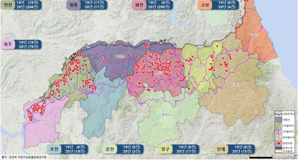 이번에 양성이 확진된 폐사체는 광역울타리 내에서 환경부 수색팀과 주민에 의해 발견됐으며, 아프리카돼지열병 표준행동지침에 따라 시료채취 후 현장 소독과 함께 매몰 처리 등 적정하게 처리됐다.