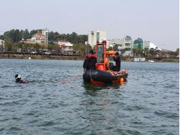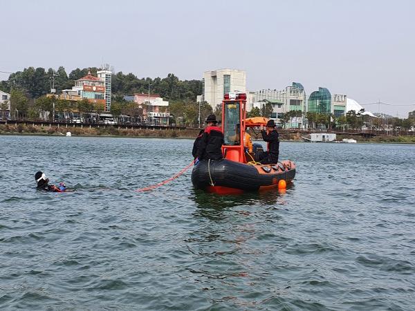 평택시 현덕면 평택호에서 실시한 이번 훈련에는 특수대응단 특수구조팀 전원이 참여해 수난기동장비와 수중음파탐지기, 잠수장비 등을 동원해 진행됐다.