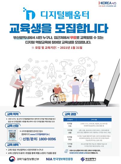특히 ‘디지털배움터(www.디지털배움터.kr)’에서도 교육을 진행해 대상자들의 편리함이 증대될 것으로 보인다. 디지털배움터란, 주민센터, 도서관 등 생활 SOC시설을 활용한 디지털 교육장으로 최근 코로나19로 인한 ‘비대면의 일상화’ 속 디지털 기기 활용에 어려움을 겪는 시민 누구나 편하게 찾아갈 수 있는 디지털 교육 및 문제해결의 장이다. 현재 부산지역 디지털배움터는 109곳으로 온·오프라인 방식의 교육을 진행하고 있다.