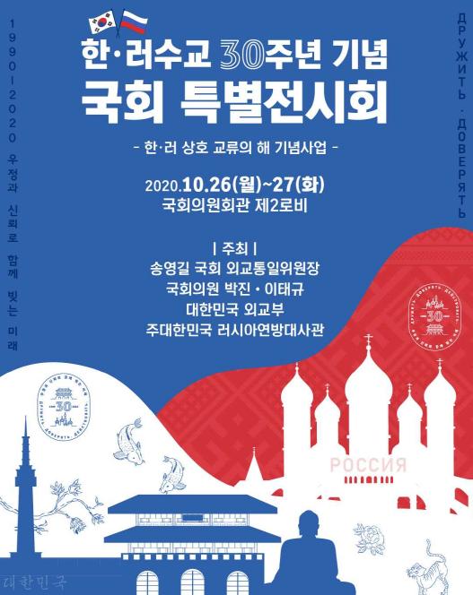 [한국4차산업신문] 외교부는 한-러 수교 30주년을 기념하여 송영길 국회 외교통일위원장, 박진 국민의힘 국회의원, 이태규 국민의당 국회의원, 주한러시아대사관 등과 함께 ‘한-러 수교 30주년 기념 국회 특별전시회’를 10.26일부터 27일까지 국회의원회관에서 공동 개최한다.