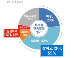 먼저 특사경 활동에 대해 도민 65%가 ‘잘하고 있다’고 평가했으며 도민의 88%가 ‘특사경 활동이 안전한 도민생활과 공정한 경기도를 만드는 데에 도움이 될 것이다’고 응답했다. 앞으로 특사경을 더욱 확대?강화해 나가는 것에 대해서는 도민 85%가 ‘찬성한다’고 답했다.