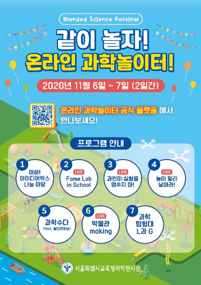 [한국4차산업신문] 서울특별시교육청 산하 과학전시관은 11월 6일(금)~7일(토) 이틀 간 학생·학부모·시민을 대상으로 「2020 같이 놀자! 온라인 과학놀이터」축제를 개최한다. 과학전시관 야외마당에서 매년 실시되던 ‘융합과학체험마당’을 올해는 수도권 3개 과학관과 연계하여 온·오프라인 과학축제로 진행한다.