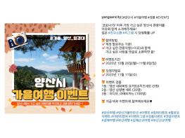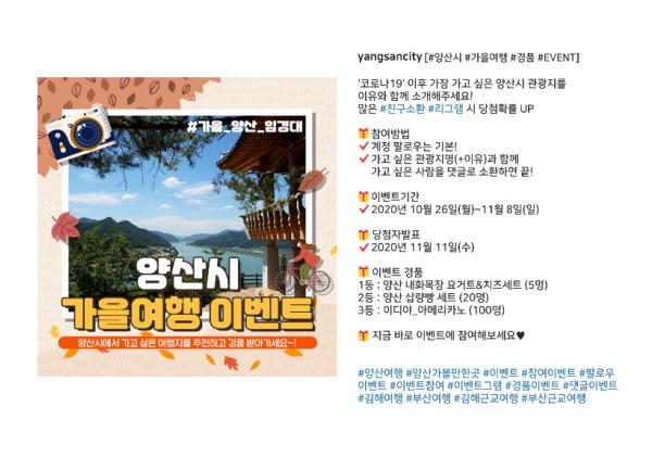 이벤트 기간은 10.26.(월)~11.8(일)까지이며 참여방법은 양산시청 공식 인스타그램 계정을 팔로우하여 가고 싶은 가을 양산 관광지를 소개하고, 함께 가고 싶은 사람을 소환하여 이벤트 게시글에 댓글을 작성하면 된다. 이벤트 종료 후 무작위 추첨을 통해 100여명에게 시 특산품인 양산 내화목장 요거트&치즈세트, 양산 삽량빵과 커피쿠폰을 지급할 계획이며, 당첨자 발표는 11.11.(수)에 할 예정이다.
