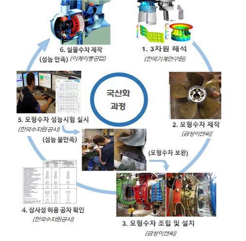 이번 국산화 개발은 한국에너지기술평가원의 '에너지기술개발사업'의 일환으로 2015년부터 올해까지 5년 4개월간 진행됐으며, 사업 주관기관인 한국수자원공사가 설계 검증 및 품질관리를 맡고 한국기계연구원은 러너 설계, ㈜금성이앤씨에서 모의실험용 수차 제작, 모의실험은 한국수자원공사 수차성능시험센터에서 담당하고 ㈜이케이중공업이 실물 러너에 대한 제작과 설치를 맡았다.
