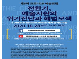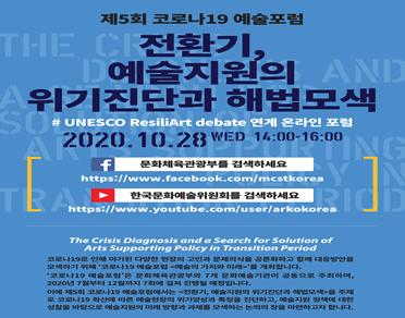 [한국4차산업신문] 문화체육관광부는 한국문화예술위원회와 함께 10월 28일 오후 2시, ‘전환기, 예술지원의 위기진단과 해법 모색’을 주제로 ‘제5회 코로나19 예술포럼’을 개최한다. 이번 토론회는 코로나19 확산 방지를 위해 무관중으로 진행되며, 문체부 페이스북과 문예위 유튜브를 통해 생중계한다.