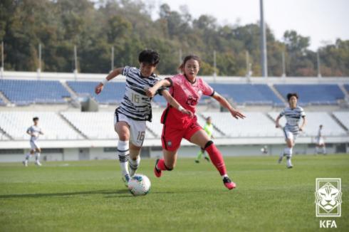 후반 8분에는 국가대표팀 역시 대규모 선수교체를 진행했다. 골키퍼 김정미를 뺀 필드플레이어 전원이 교체됐다. 국가대표팀은 선수교체 이후에도 강한 압박을 이어가며 U-20 대표팀을 밀어붙였다. U-20 대표팀에서는 교체 투입된 강지우가 국가대표팀 수비진의 뒷공간을 노렸다.