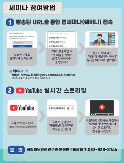 유튜브에서 ’국립재난안전연구원‘ 계정을 검색하여 생중계되는 세미나에 참여할 수 있으며, 메일 등을 통해 미리 발송된 URL 접속을 통해서도 생중계를 시청을 할 수 있다.