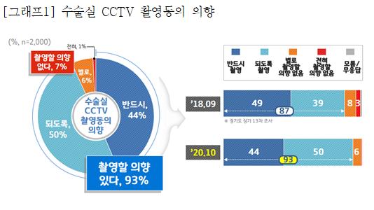 도는 9월 25일부터 10월 7일까지 도민 2,000명을 대상으로 수술실 CCTV 인식 관련 여론조사를 실시한 결과, 조사대상의 93%가 수술을 받게 된다면 CCTV 촬영에 동의하겠다고 답했다고 28일 밝혔다. 이는 2018년 조사 시 촬영 동의 비율인 87%보다 6%p 상승한 수치다.