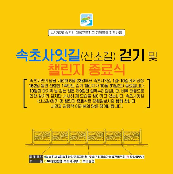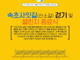 [한국4차산업신문] 속초시와 속초시지속가능발전협의회는 10월 31일 오전 10시, 지난 5월 23일부터 속초사잇길 1길~10길에서 장장 162일 동안 진행한 1백만보 걷기 챌린지 종료식과 더불어 2020년 산소길(O2) 걷기행사를 겸하여 실시한다.
