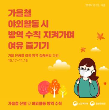 [한국4차산업신문] 가을 단풍철 야외활동 증가로 인한 코로나19 확산 차단하기 위해 10월 17일(토)~11월 15일(일)까지 방역 집중관리 기간을 지정한다.