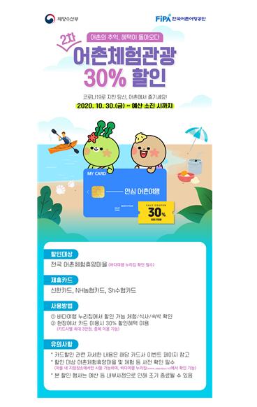 해양수산부는 지원사업을 다시 준비하면서 다소 복잡했던 할인신청 과정을 더욱 간소화했다. 당초에는 이용자가 해당 카드사에 미리 어촌체험 할인을 신청하고 이용해야 했으나, 이제는 별도 신청 없이 현장에서 해당 카드로 결제하면 즉시 이용료의 30%(최대 3만 원) 청구할인 혜택을 받을 수 있다. 할인이 가능한 카드는 신한카드, NH농협카드, Sh수협은행 등 3개 카드사이며, 신용카드와 체크카드 모두 사용할 수 있다. 1인 1회 한정이었던 조건도 사라져 카드사별로 최대 3만 원의 범위 내에서 중복 할인도 가능하다.