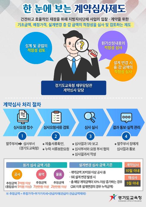 계약심사는 입찰·계약을 하기 위한 기초금액, 예정가격의 적정성과 적법성을 심사하고 검토하는 제도로, 도교육청은 재정 건전과 효율을 높이기 위해 2012년 17개 시·도교육청 가운데 최초로 도입했다.