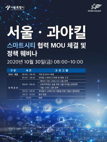 서울시는 협약식 이후 양 도시 간 스마트시티 정책과 경험을 공유하는 ‘정책 웨비나’도 개최한다. 특히, 에콰도르 등 해외 진출을 희망하는 관련 민간기업을 대상으로 사전 참가 신청을 받아 민관이 함께하는 자리로 마련했다.