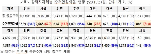 전국 모든 공동주택 단지(3만 738개) 중 공공수거 또는 가격연동제 등으로 수거중단·거부 우려가 적은 단지의 비율(수거 안정화율)은 88.8%(2만 7,293개)인 것으로 나타났다.
