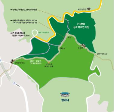 한양도성 성곽에서 북악스카이웨이 사이는 자연 친화적 탐방로로 정비했으며 일부 군 시설물들은 기억의 공간으로 보존된다.