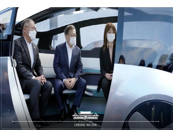 토크콘서트가 마무리된 후, 문재인 대통령은 전시된 미래차 글로벌 경쟁력 제품을 둘러보았습니다. 미래 기술력의 비전과 컨셉이 담긴 미래교통수단인 UAM(도심항공교통), 제네시스 컨셉카 등을 둘러본 다음, 전기차 전용 플랫폼인 E-GMP 플랫폼도 관람했습니다. 또, 유니스트 미래차연구소의 연구성과물인 PAV(개인자율운항비행체), 초소형자율주행전기차 등도 살펴봤다.