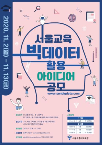 2019년에 이어 두 번째로 열리는 이번 공모전은 ‘교수·학습, 교육행정, 교육시설 등 서울교육정책 및 서비스에 반영될 빅데이터 활용 아이디어 도출’이라는 주제로 진행된다.