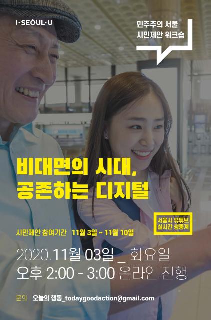 [한국4차산업신문] 서울시는 11월 3일 오후 2시 ‘비대면의 시대, 디지털 소외계층과 공존하는 방법’에 대한 시민의 다양한 제안을 발굴하기 위해, ‘온라인 시민제안 워크숍’을 개최한다.