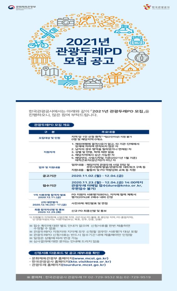 ‘관광두레 피디’ 모집과 관련된 신청 방법, 관련 서식 등 자세한 내용은 문체부(www.mcst.go.kr)와 한국관광공사(www.visitkorea.or.kr), 관광두레 누리집(www.tourdure.mcst.go.kr)에서 확인할 수 있다.