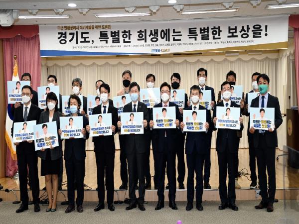 경기도가 주관하고 10명의 국회의원(김민철, 김성원, 박정, 설훈, 송옥주, 오영환, 윤후덕, 이원욱, 전용기, 최종윤, 가나다순)이 공동주최한 이날 토론회에는 관계부처 전문가, 시군, 지역주민, 도의원 등이 참여해 ‘경기도, 특별한 희생에는 특별한 보상을!’을 주제로 열띤 논의를 벌였다.