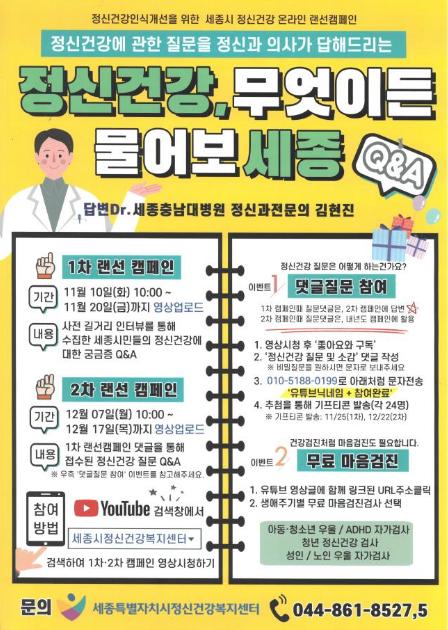 캠페인은 세종충남대학교병원 정신건강의학과 전문의이자 시 정신건강복지센터장인 김현진 교수가 직접 시민들의 질문에 답변하는 방식으로 진행하며, URL을 통한 정신건강 선별검사도 실시한다.