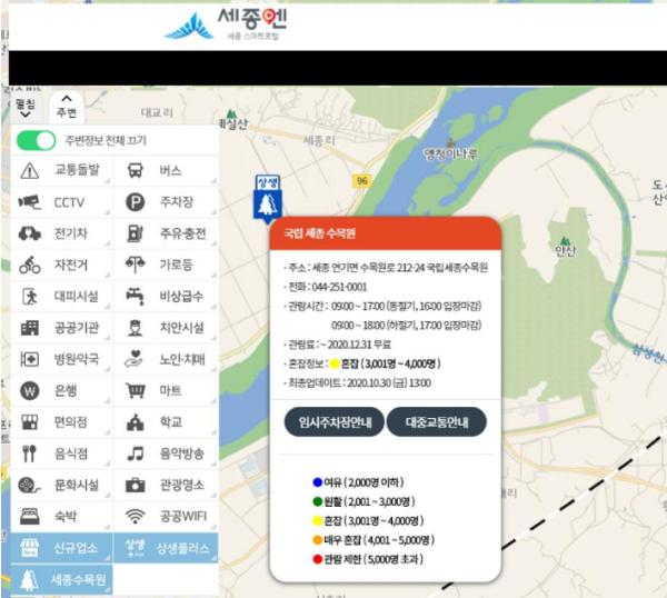 국립세종수목원의 혼잡도 정보를 확인하기 위해서는 네이버·다음 등에서 ‘세종엔’을 검색한(www.smartsejong.kr) 후 접속하면 된다.