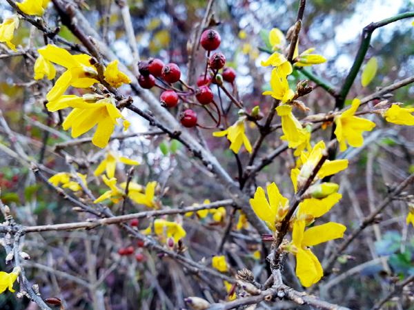 겨울의 시작을 알리는 입동을 나흘 앞둔 4일 영하의 날씨에도 불구하고 의령군 한우산 800m 정상 부근에 개나리가 만개해 찔레꽃 열매(색미자)와 어울려 등산객들의 발길을 멈추게 하고 있다.