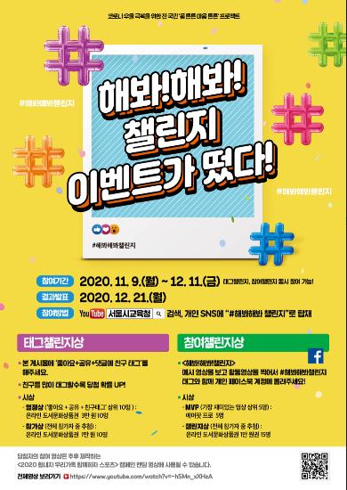 「해봐! 해봐! 챌린지」캠페인은 유튜브 서울시교육청 채널에 11월 9일(월) 챌린지 1탄 영상 공개를 시작으로, 매주 월요일마다 새로운 챌린지 영상을 제시할 예정이다.