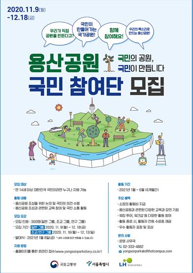 [한국4차산업신문] 국토교통부, 서울특별시, 한국토지주택공사는 관계기관 합동으로 용산공원 조성계획안에 대한 국민들의 의견을 듣고, 이를 최종 공원 계획에 반영하기 위해 ‘용산공원 국민 참여단’ 300명을 모집한다.