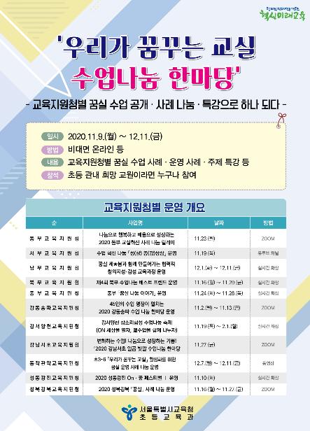 이번 수업나눔 한마당은 11개 교육지원청별로 비대면 온라인으로 운영된다. ‘꿈실(우리가 꿈꾸는 교실)’ 운영 사례, 수업 공개, 특강 등의 내용으로 초등학교 관내 희망 교원이라면 누구나 참여할 수 있다.