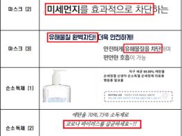 주요 적발사례는 ▲바이러스 예방, 살균, 피부재생 등 의약품 오인광고(6건) ▲물, 비누 없이 사용 등 소비자 오인광고(16건)였다.