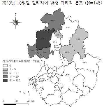 한편 경기보환연이 지리정보시스템(Geographic Informaton System)을 이용해 지난 2015년부터 올해 10월까지 도내 말라리아 발생 사례 1,116건을 조사한 결과, 가평군, 고양시 덕양구, 고양시 일산동구, 고양시 일산서구, 김포시, 남양주시, 동두천시, 양주시, 양평군, 연천군, 의정부시, 파주시, 포천시 등을 제외하고 나머지 경기도 지역에서는 말라리아 감염이 발생하지 않은 것으로 추정했다.
