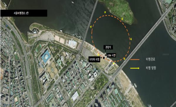 실증에는 2인승급 드론기체 1대가 투입되며, 해발 50m 상공에서 여의도 한강공원, 서강대교, 밤섬, 마포대교 일대 1.8km를 두 바퀴(총 3.6km) 약 7분간 비행한다. 서울의 중심이자, 우리나라 최초의 비행장이 있던 여의도에서 비행한다는 점에서 의미가 더 크다.