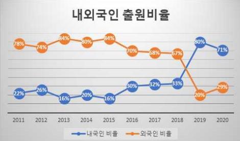 특허청의 최근 10년간(‘11년 ~ ’20년), EUV 노광기술의 특허출원 분석에 의하면, ‘14년 88건을 정점으로 ’18년 55건, ‘19년 50건 등으로 나타났으며, 특히 ’19년부터는 내국인의 출원이 외국인의 출원 건수를 앞서게 되어, 국내 기술이 성장기에 접어들고 있는 것으로 분석되었다.
