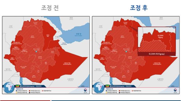 이번 조정은 최근 동 지역 내에서 에티오피아 연방군과 티그라이인민해방전선(TPLF) 간 무력충돌로 인해 다수의 사상자가 발생한 것으로 보도되는 등 우리 국민의 안전 우려가 증가하고 있는 점을 감안한 것이다.