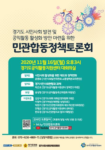 경기도, 경기도의회, 경기시민사회단체연대회의가 공동으로 주최하고 경기도공익활동지원센터(이하 센터)가 주관하는 이번 토론회는 주제발표와 패널 토론 순으로 진행된다.