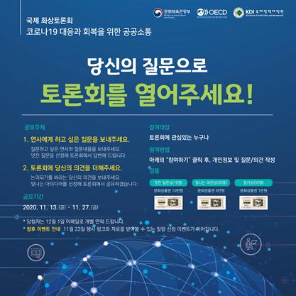 문화체육관광부는 경제협력개발기구(OECD), 한국개발연구원 국제정책대학원(KDIS)과 함께 12월 9일(수) 오후 4시부터 국제 화상토론회 ‘코로나19 대응과 회복을 위한 공공소통’을 개최한다. 이번 토론회는 코로나19 상황을 고려해 현장(서울 더 플라자 호텔 다이아몬드홀)과 온라인[케이티브이(KTV) 국민방송 유튜브 채널]에서 동시에 진행한다.