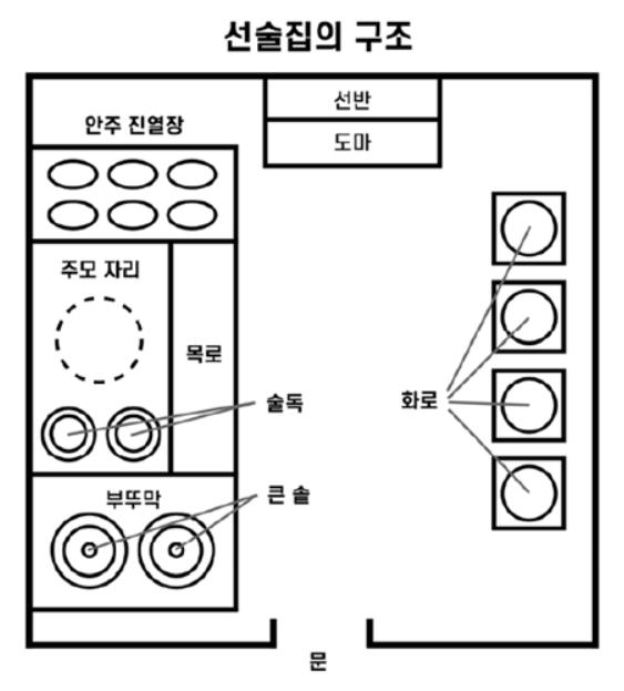 채만식 소설 「산?」을 통해 보면, 선술집의 공간구조를 파악할 수 잇다. 선술집의 문을 들어서면 왼편에 부뚜막과 큰 솥이 잇고, 그 옆에는 목로와 술아범이 자리하고 있다. 목로의 오른편에는 갖은 안주를 진열해 놓은 안주장이 있고, 목로의 정면에는 화로가 놓여있었다.