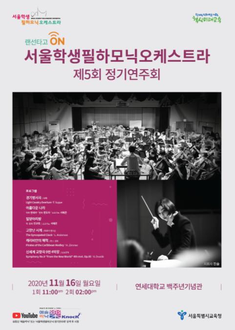 [한국4차산업신문] 서울특별시교육청은 11월 16일(월) 연세대학교 백주년 기념관에서 제5회 서울학생필하모닉오케스트라 정기연주회를 실시간 온라인으로 진행한다. 이번 정기연주회는 코로나19 예방을 위하여 2회(오전 11시, 오후 2시)로 나누어 비대면으로 실시하며, 창의예술교육기부팀 유튜브 공식 채널 ‘예술락樂낙knock’에서 랜선 공연으로 동시 진행된다.