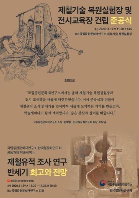 또한, 2014년부터 추진해 온 『제철기술 복원연구』사업이 한 단계 도약할 수 있는 새로운 계기를 모색하기 위하여 한국철문화연구회와 공동으로 『제철유적 조사연구 반세기 회고와 전망』이란 주제로 학술발표회를 개최해 19일 오후 1시 30부터 20일 오전 12시까지 국립중원문화재연구소 유튜브 채널로 실시간으로 중계한다.