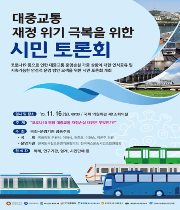 [한국4차산업신문] 서울특별시 서울교통공사 등 전국 6개 도시철도 운영기관은 여야 국회의원(더불어민주당 우원식?이해식?천준호 의원, 국민의힘 이헌승 의원, 정의당 이은주 의원), 전국버스운송사업조합연합회와 16일(월) 9시30분 국회 의원회관 소회의실에서 ?대중교통 재정 위기 극복을 위한 시민토론회?를 공동 개최한다고 밝혔다.