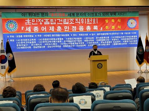 [한국4차산업신문] 2020년 11월 13일 오후 2시에 국회도서관 대강당에서 더불어민주당 오영훈 국회의원실이 주최하고 사단법인 훈민정음기념사업회가 주관한 훈민정음탑건립조직위원회 발족식이 『세종어제훈민정음 총록』헌정식을 겸해 코로나 19의 규칙을 준수하여 50명만 참석한 가운데 거행되었다.