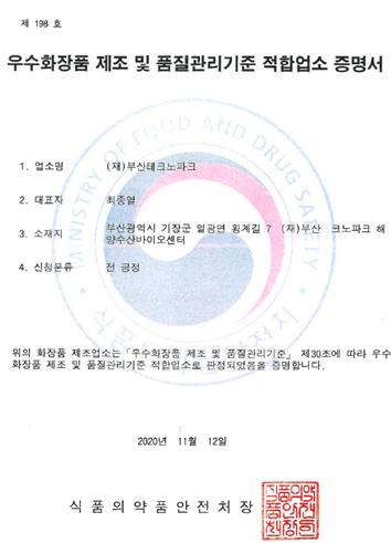 ‘부산화장품공장’은 지역 내 화장품 생산시설로는 ㈜아마란스에 이어 두 번째로 CGMP 인증을 획득했으며, 지난 3월에는 국제표준화 기구가 제정한 ‘화장품 산업의 국제표준 규격’인 ISO22716 인증을 받아 부산화장품 공장의 우수성을 인정받은 바 있다.