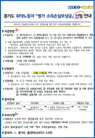‘병가 소득손실보상금’은 일용직 노동자 등 도내 취약노동자들이 코로나19 의심 증상 시 생계걱정 없이 안심하고 검진을 받을 수 있도록 1인당 23만원을 지원하는 경기도의 노동방역대책이다.