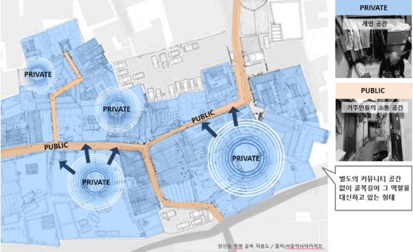 쪽방의 구조는 지역에 따라 차이는 있지만 대체로 좁고 열악한 개별실(6.6㎡(2평) 미만 77.3%)에 공동 현관, 화장실, 주방이 배치돼 있는 구조다. 별도의 커뮤니티 공간 없이 좁은 골목길이 그 역할을 대신하고 있는 형태를 보이고 있다.