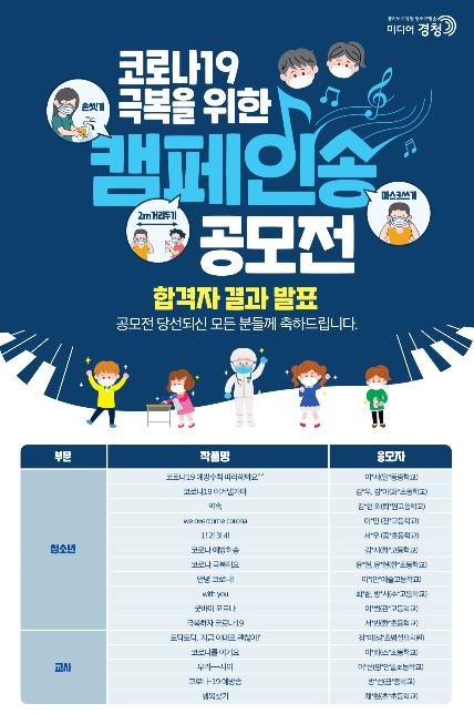 청소년 부문 선정곡은 코로나19 예방수칙을 모두가 함께 지키길 바라는 마음을 담은 이예서 학생(일산동중)외 5명의 ‘코로나19 예방수칙 따라 해봐요’를 비롯해 ▲코로나19 이겨낼 거야, ▲we overcome corona, ▲코로나 예방하송 등이다.