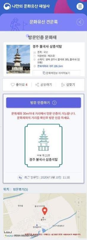 「나만의 문화유산 해설사」앱에 신규로 추가되는 ‘문화유산 견문록’ 서비스는 문화유산 방문 전 위치정보와 길안내를 해주고, 문화유산 현장에서 방문내역을 공식 인증하는 방문인증 기능(온라인 도장 찍기)을 제공한다. 주요서비스는 ① 문화유산 방문인증, ② 방문후기 작성·공유, ③ 문화유산 스탬프북, ④ 문화유산 스탬프 순위 등이며, 자세한 사항은 「나만의 문화유산 해설사」누리집(www.heritage.go.kr/mh)을 방문하면 정보를 얻을 수 있다.