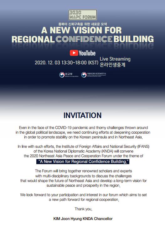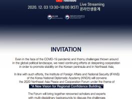 [한국4차산업신문] 외교부 및 국립외교원은 12.3일과 4일 양일간 ‘동북아 신뢰구축을 위한 새로운 모색(A New Vision for Regional Confidence Building)’을 주제로 ‘2020 동북아평화협력포럼(2020 Northeast Asia Peace and Cooperation Forum)’을 개최한다.